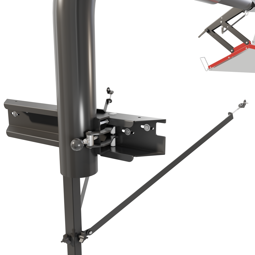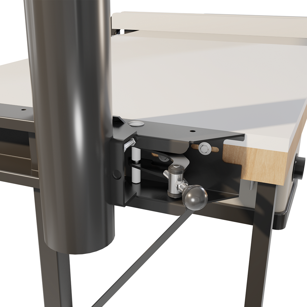 - Un support de potence de 23-½"(600mm) de long x 3-¾"(95mm) de haut conçu pour être boulonné sur le côté de l’allonge de table de la scie. Il est fourni avec un pied tubulaire réglable au niveau du plancher ainsi que 2 entretoises métalliques destinées à stabiliser la potence et à maintenir le tube principal parallèle à la table de la scie.
