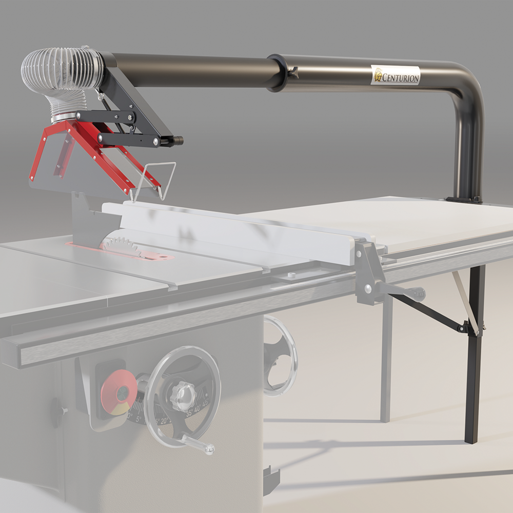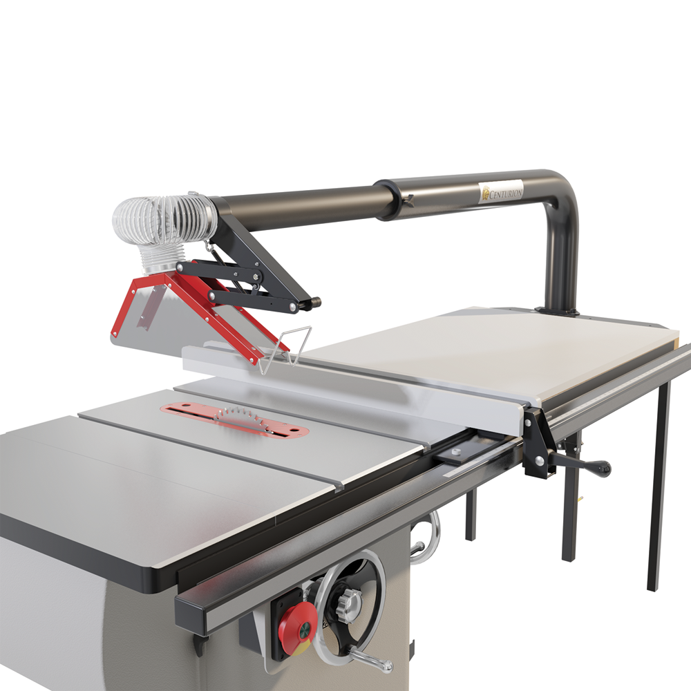 - Une potence robuste composée de 2 tubes métalliques : Un tube intermédiaire de 3"dia muni d’un bras en acier destiné à soutenir le couvre-lame. Un boyau d’aspiration flexible clair de 3"dia est inclus pour raccorder le capot directement au tube.Un tube principal coudé de 4"dia dans lequel le tube intermédiaire se déplace. La fonction télescopique permet un déplacement de 30"(760mm) offrant ainsi un dégagement de 66"(1675mm) à droite de la lame. L’espace entre le tube et le dessus de table peut atteindre 13-½"(340mm). À l’autre extrémité, un boyau d’aspiration de 4"dia peut y être attaché.