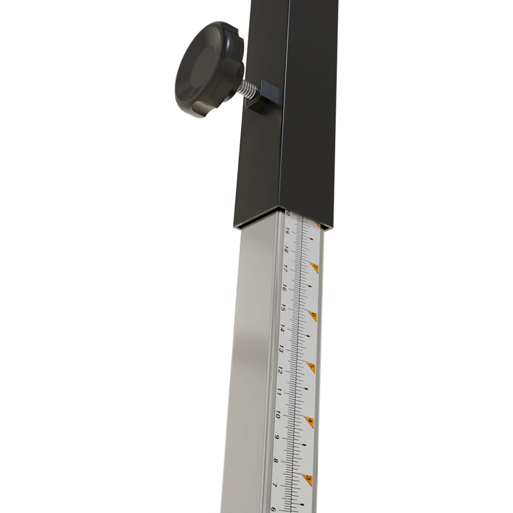 • Il est muni de 4 pattes tubulaires ajustables avec échelle graduée et bouton de serrage manuel sur chacune