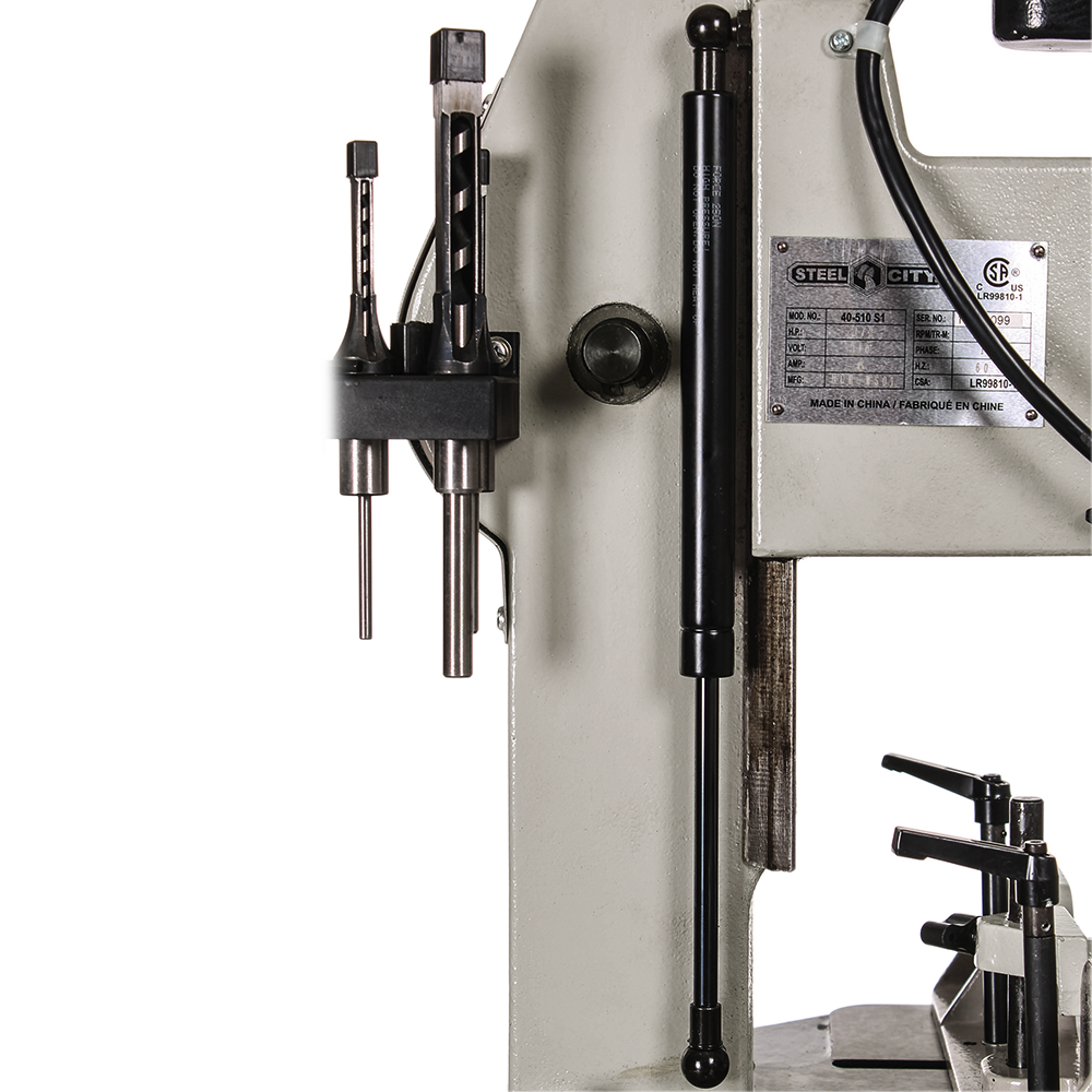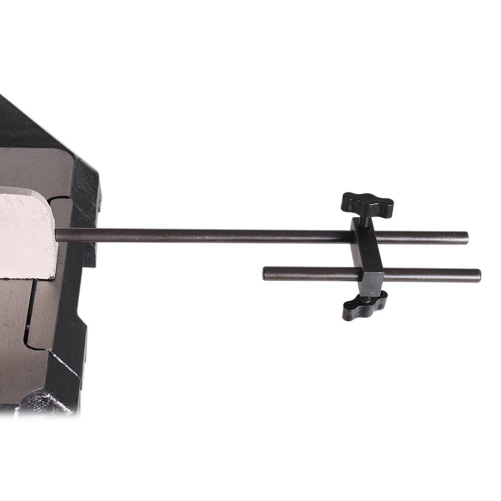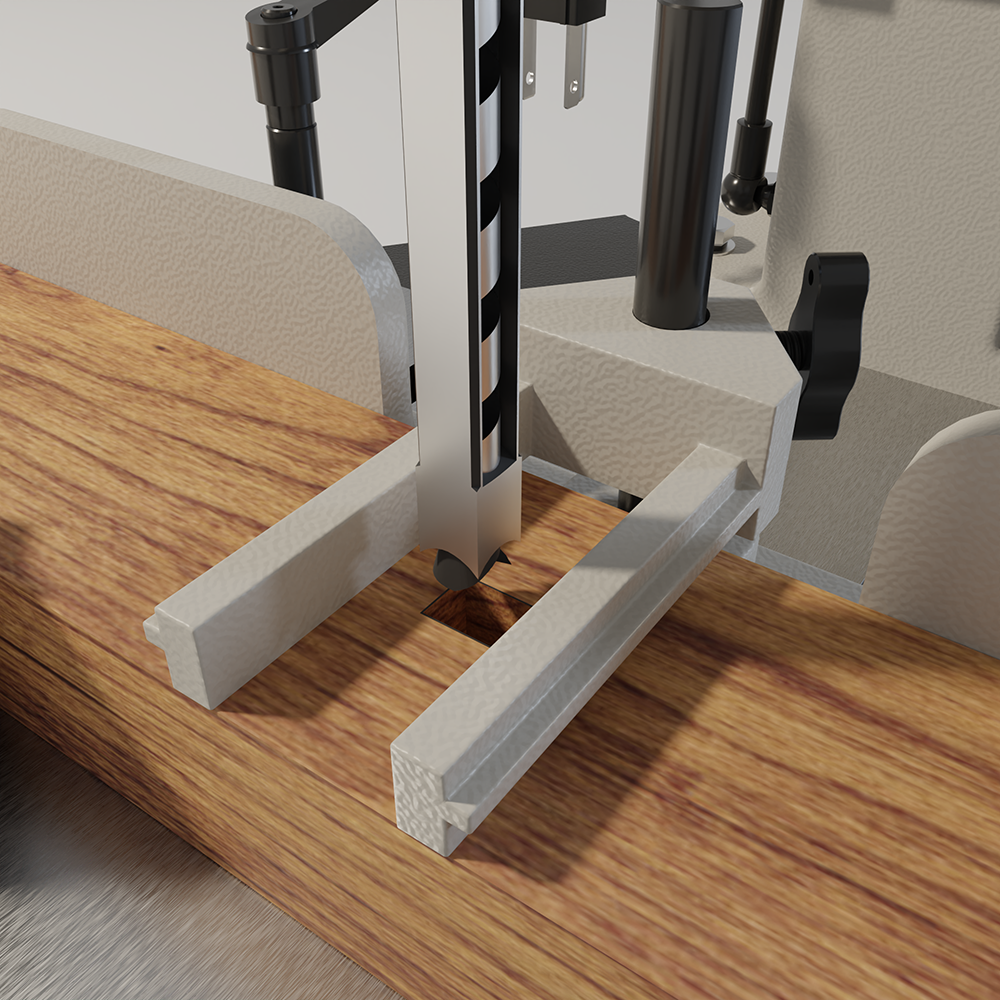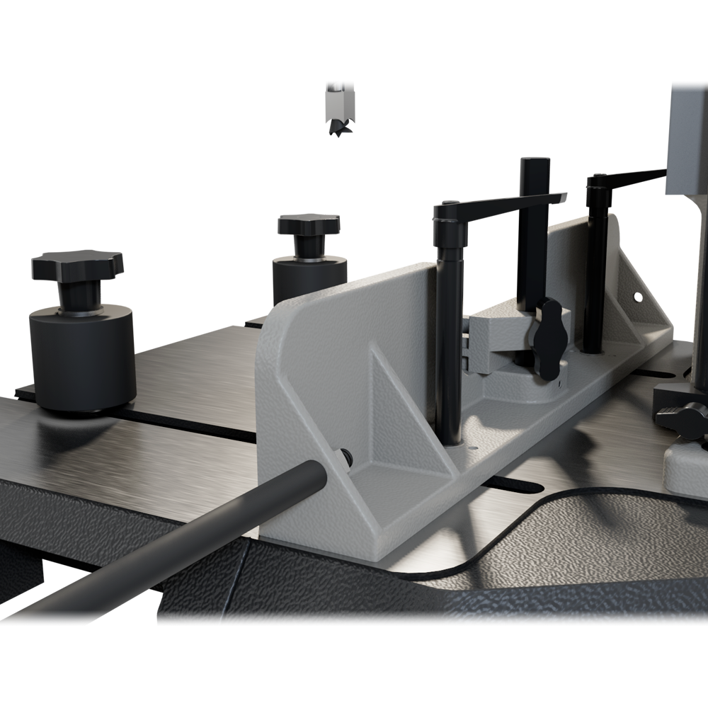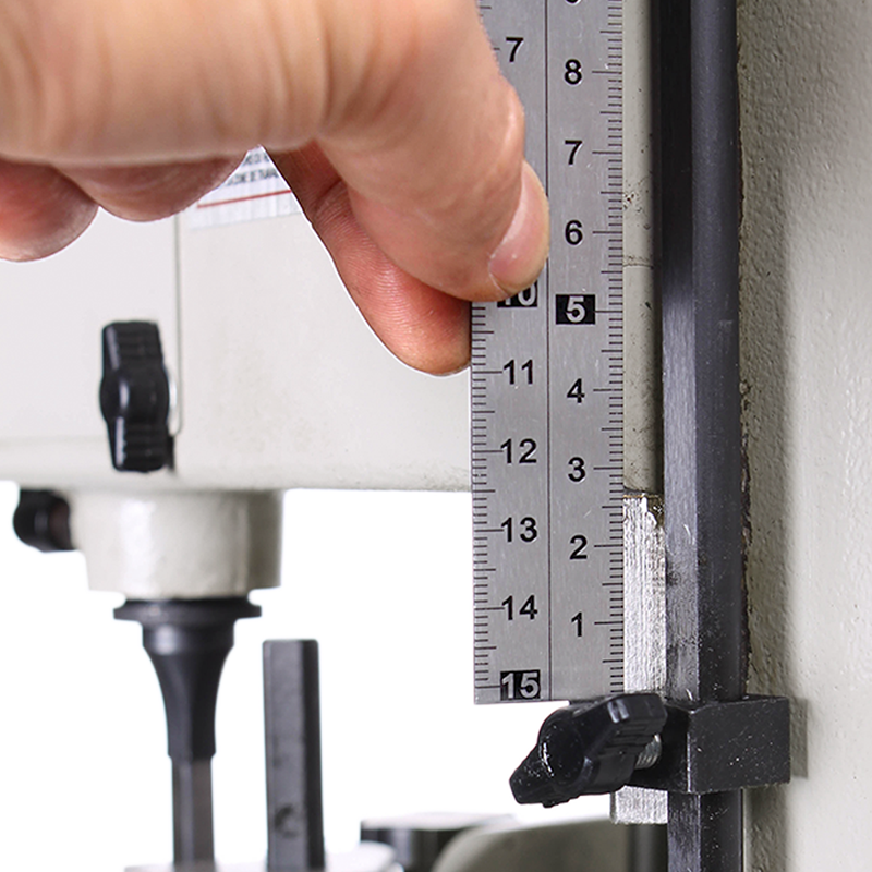 - Un presseur vertical ajustable de 0 à 4"(100mm) est fixé au guide afin de maintenir la pièce en place lors de la remontée du ciseau