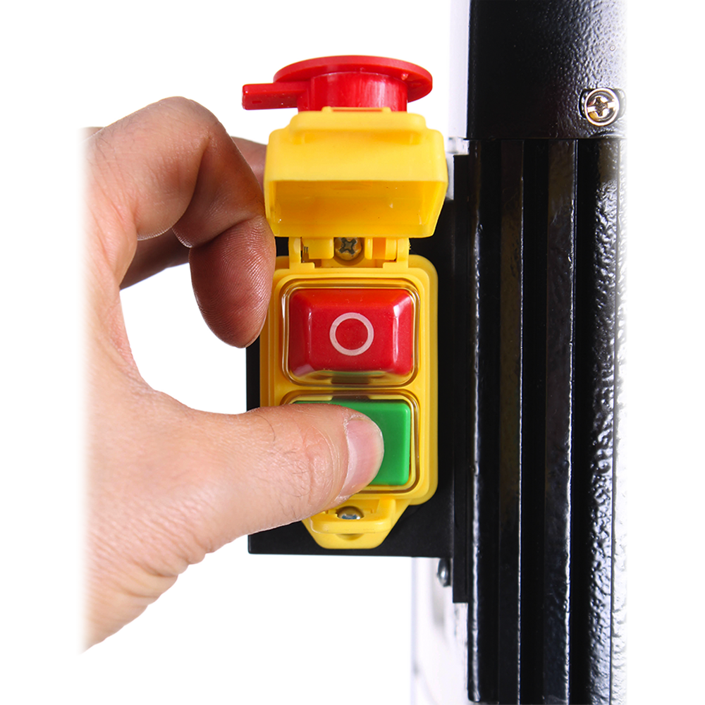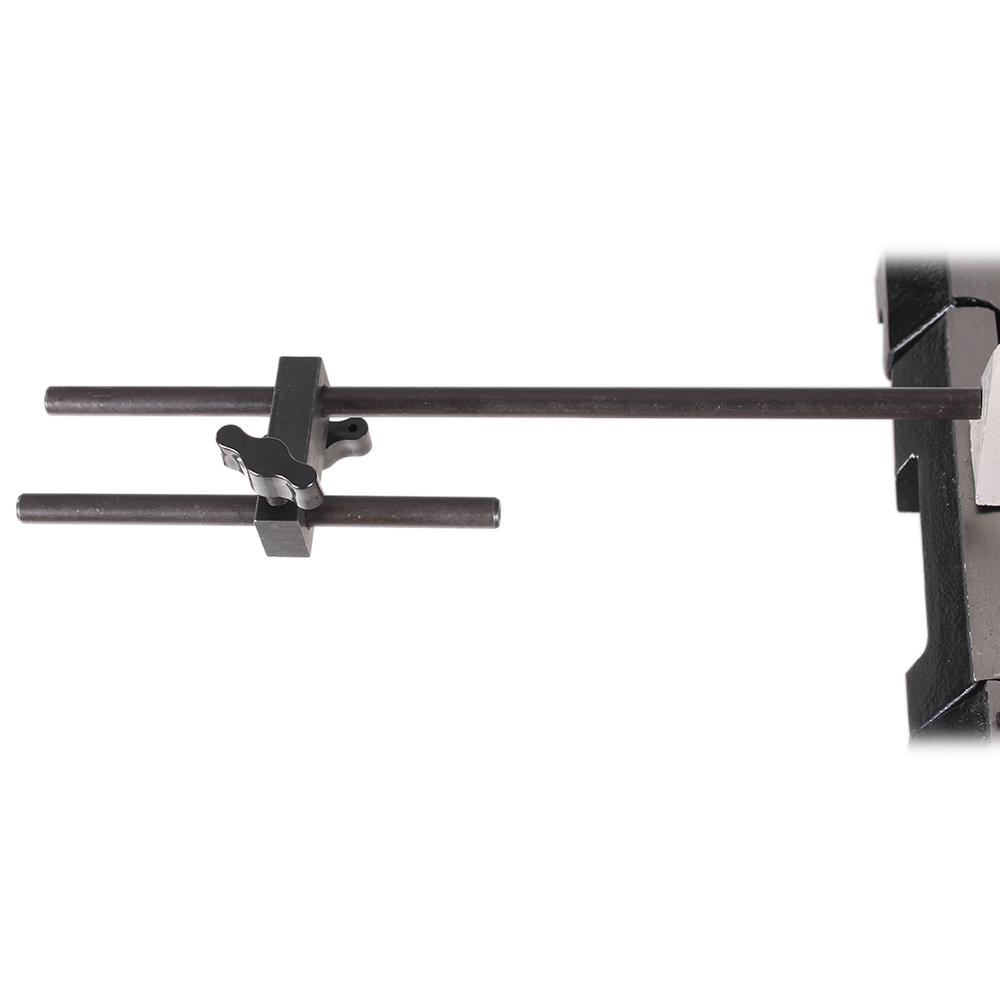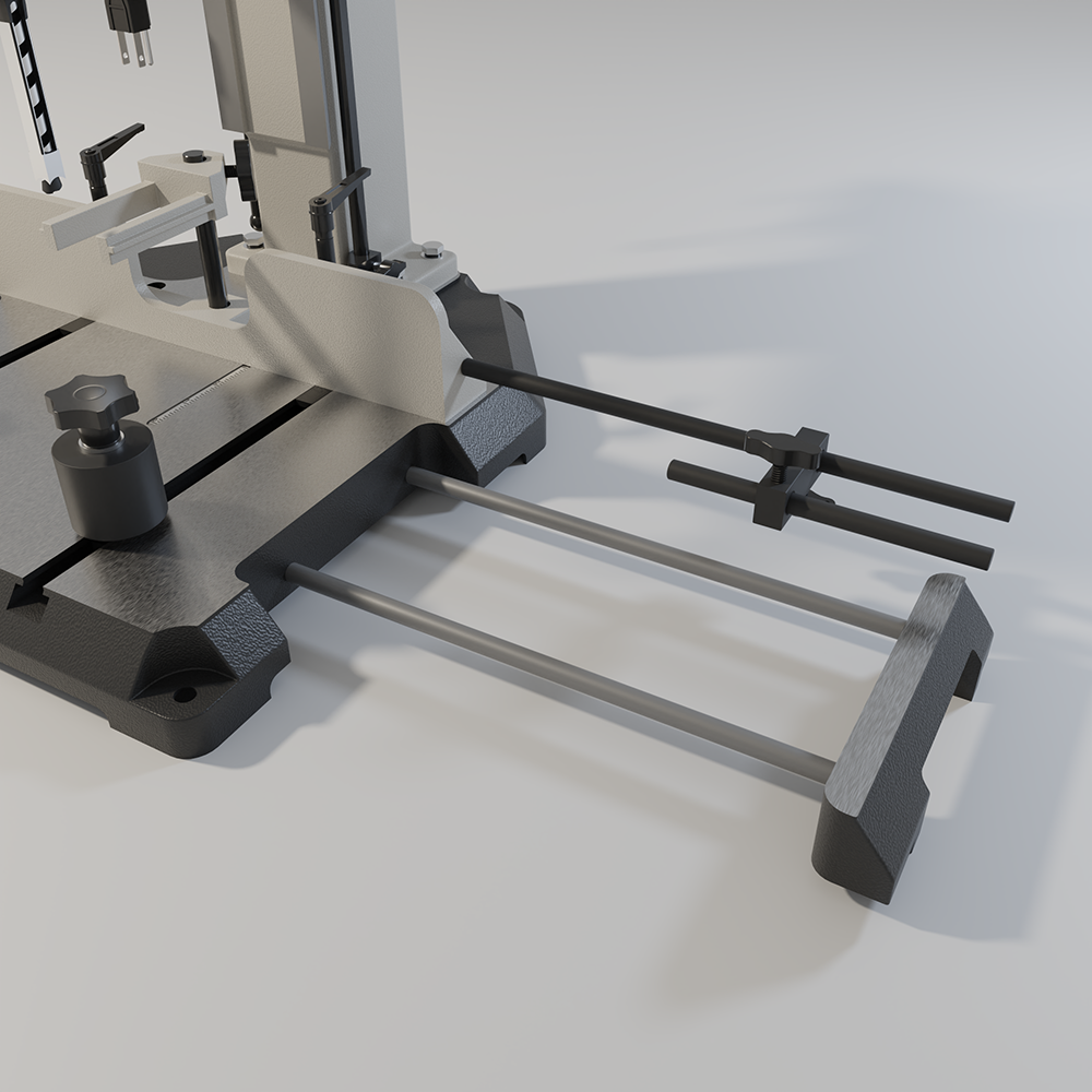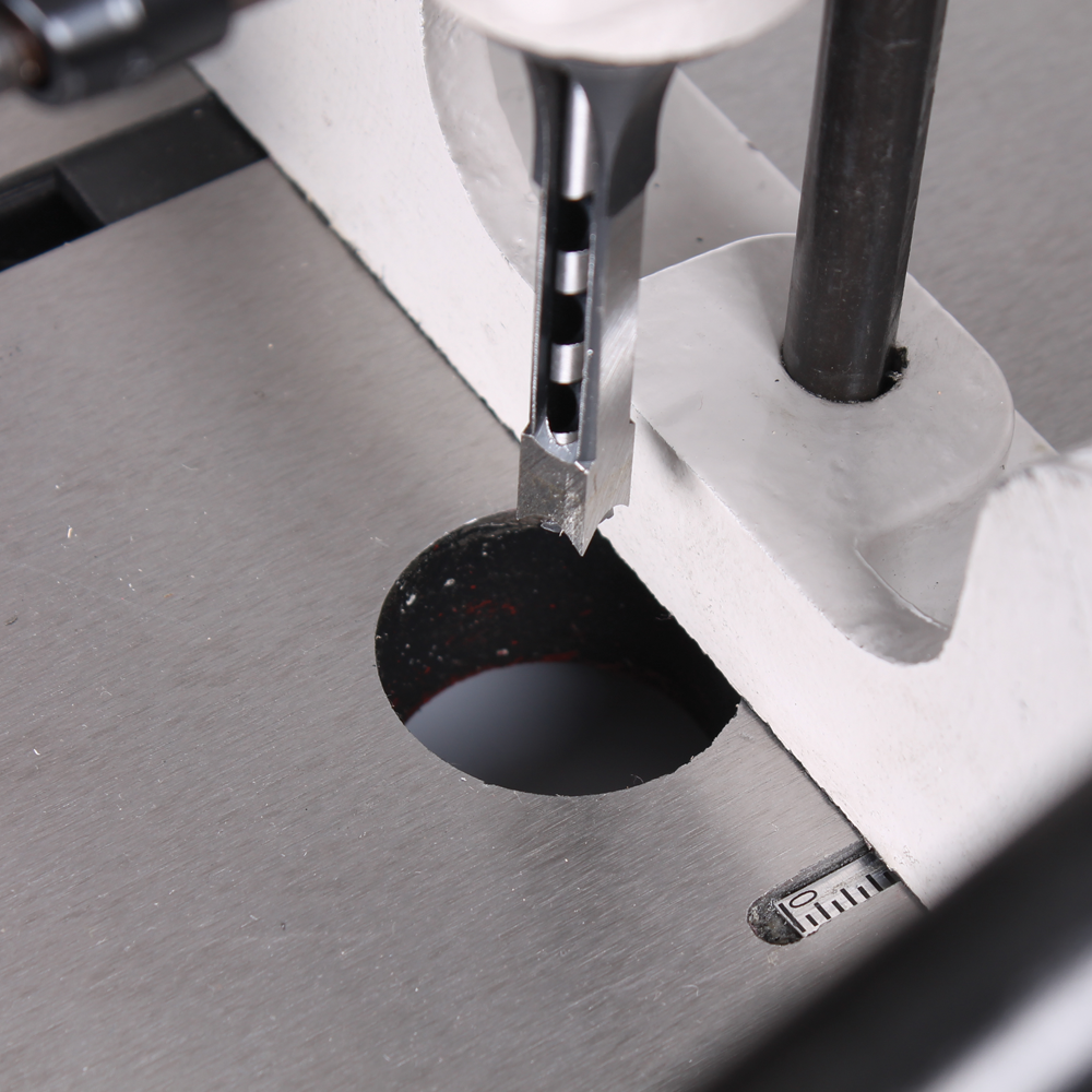 - Un presseur vertical ajustable de 0 à 4"(100mm) est fixé au guide afin de maintenir la pièce en place lors de la remontée du ciseau