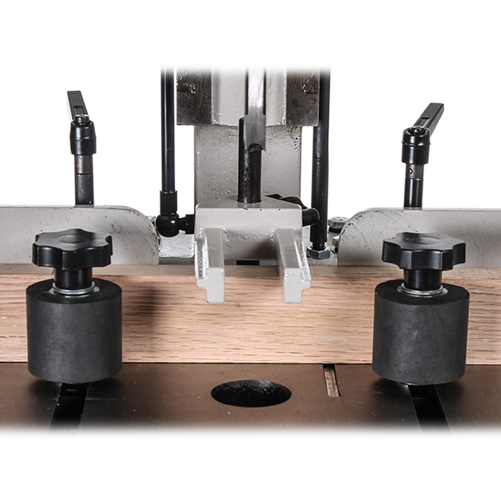 - 2 presseurs à rouleaux caoutchoutés latéraux permettent d’appuyer et de retenir la pièce contre le guide sans la laisser de marques
