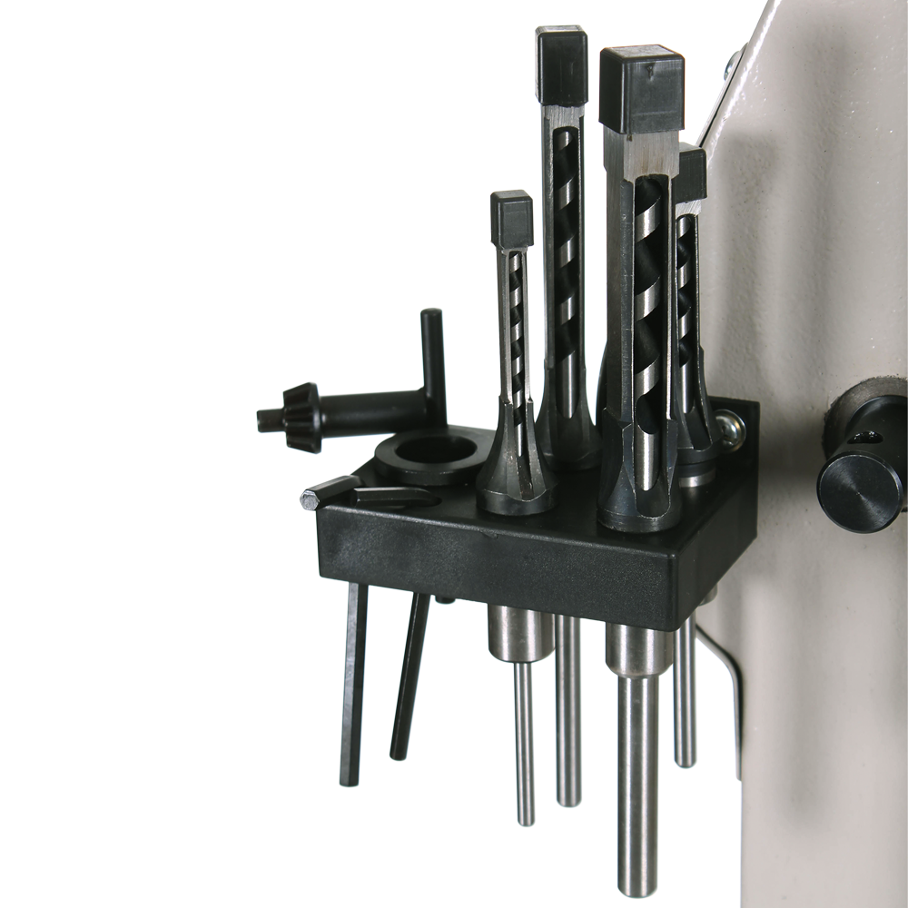 - La machine vient avec 4 jeux de bédanes + forets pour carrés 1/4", 5/16", 3/8" et 1/2" ainsi qu’un râtelier