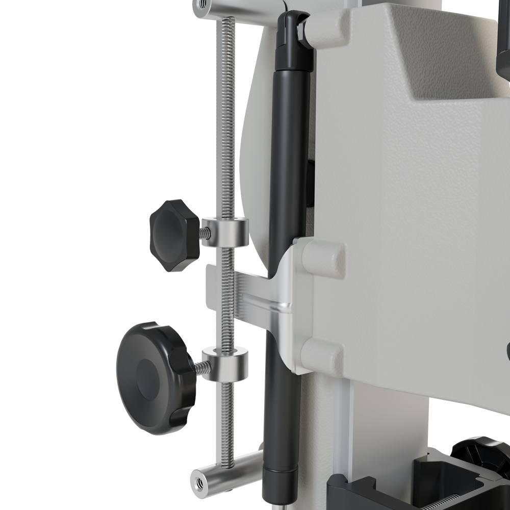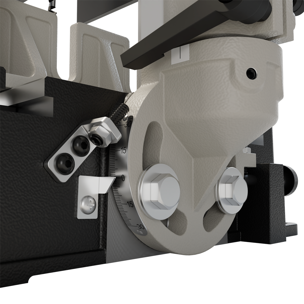 - La tête est montée sur des glissières à queue d'aronde usinées avec précision - sa course est contrôlée par un cylindre amortisseur au gaz pour une opération en douceur.