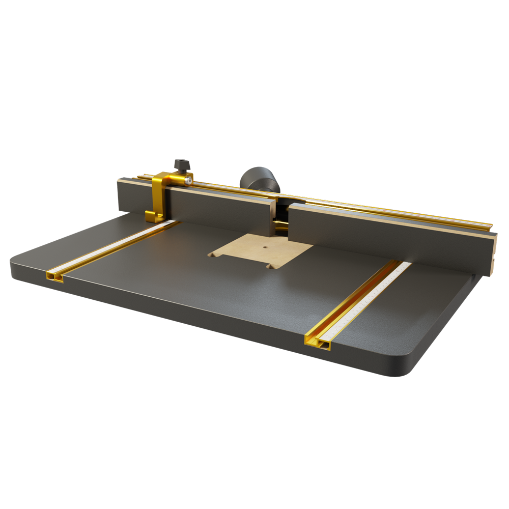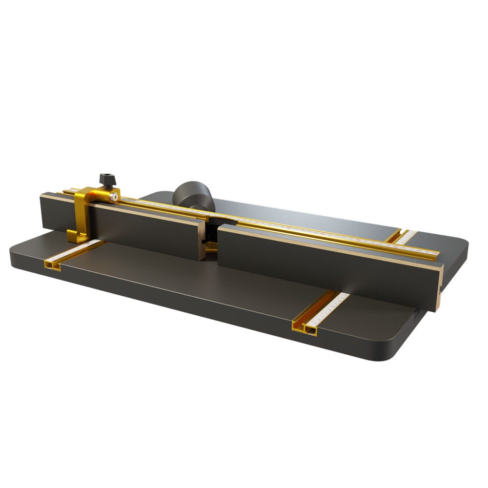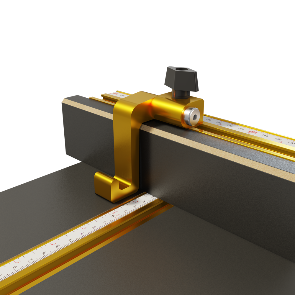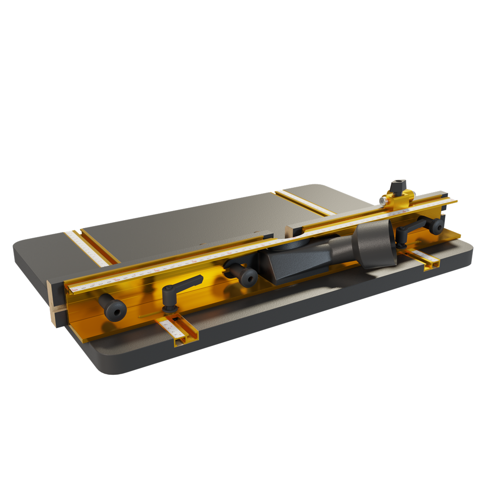 - 2 rails d’aluminium en T avec échelles de mesure (imp/mét) y sont incorporés pour permettre l’ajustement et le maintien du guide. Ils peuvent également être utilisés pour fixer et retenir certaines pièces (par le biais de diverses serres de rétention) afin d’éviter que celles-ci puissent grimper sur la mèche